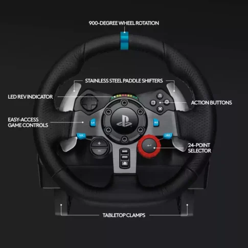 Get an immersive racing experience with the Logitech G29 Driving Force Racing Wheel. The G29 features a 10.24″ racing wheel covered with hand-stitched leather. The wheel rotates up to 900° and features dual-motor force feedback for a realistic driving experience. In addition to the wheel, the G29 also comes with a 3-pedal set. The throttle, brake, and clutch pedals allows you to accelerate, brake, and change gears with the feel of an actual car. The nonlinear brake pedal mimics a pressure-sensitive brake system for a more responsive, accurate braking feel. There are also rubber feet for hard surfaces and a patented retractable grip system for carpets.